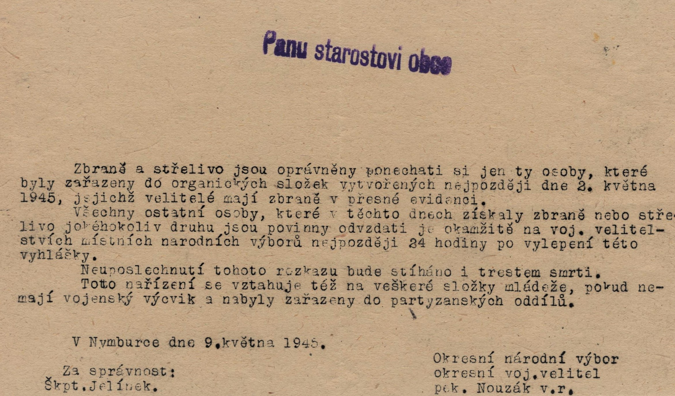 - Příkaz okresního vojenského velitele v Nymburce, 9.5. 1945[0.8MB/jpg]