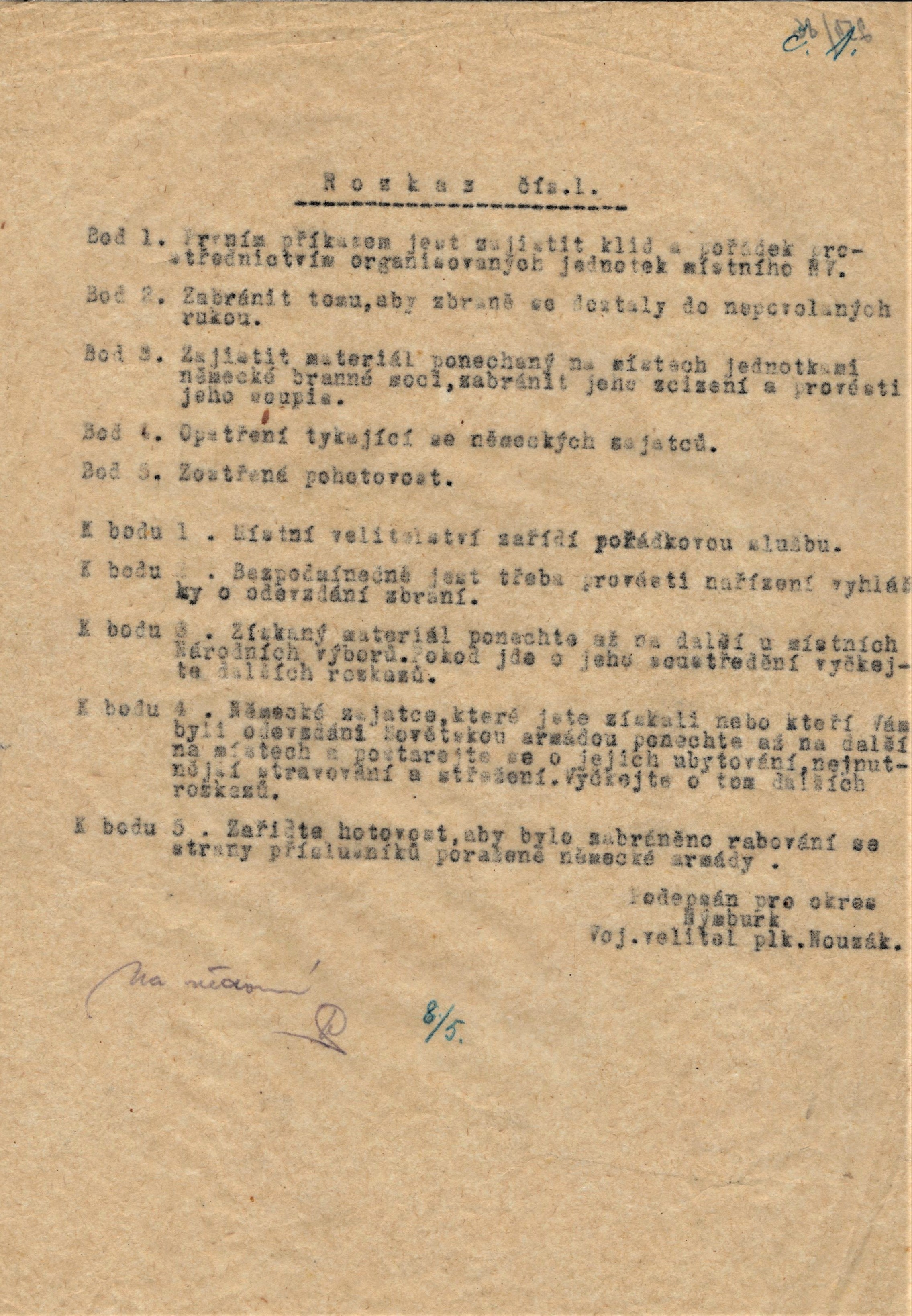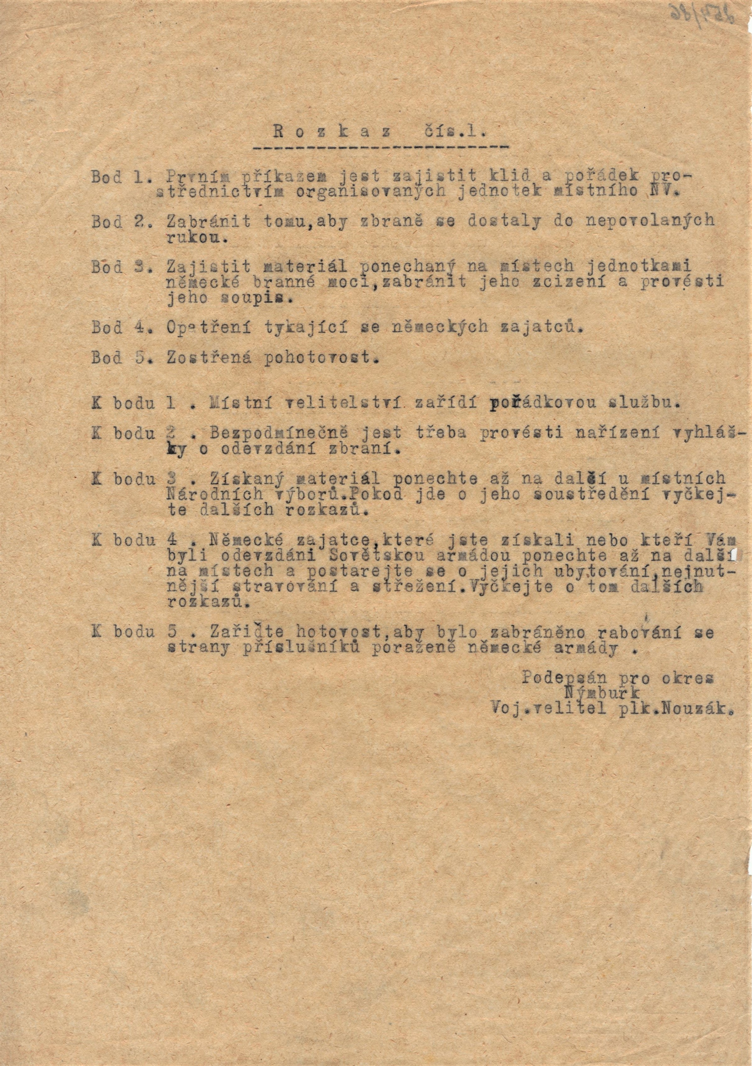 - Rozkaz č. 1 okresního vojenského velitele v Nymburce, 8.5. 1945[2MB/jpg]
